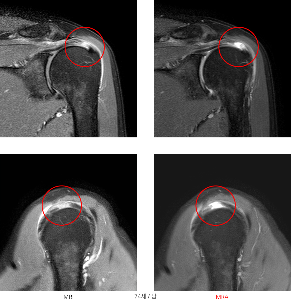 MRA(MR-Arthrogram)란, 관절 속에 조영제를 주입한 후 촬영하는 검사로, 관절와순이나 회전근개의 찢어진 틈으로 조영제가 스며들어가 파열 여부를 더욱 정확히 진단할 수 있게 됩니다.