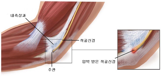 주관증후군이란, 팔꿈치 관절에서 척골신경이 눌려 통증을 유발하는 질환입니다.
