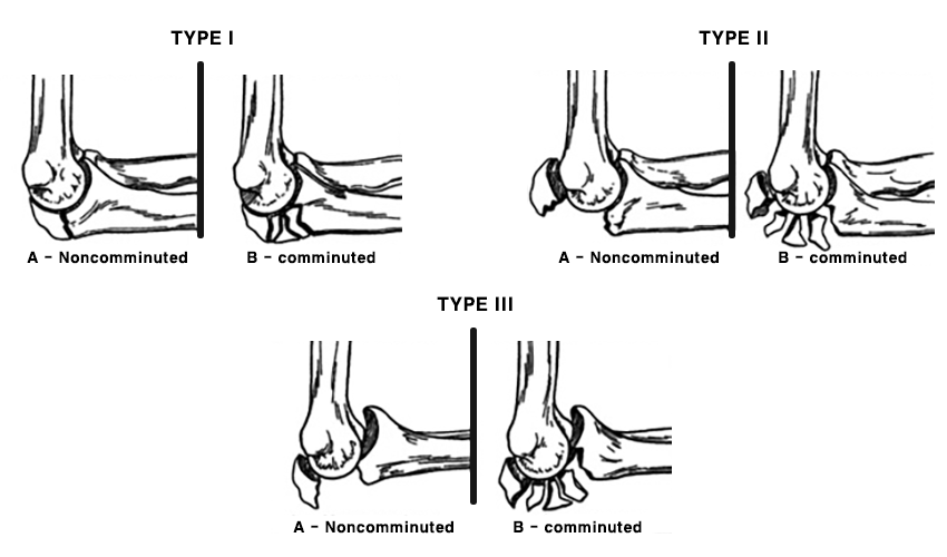 ※ 구상돌기 골절의 경우 단독손상은 드물며, 주관절 탈구와 요골두 골절과 동반되어 발생하는 경우가 가장 흔합니다. 축성압박 및 외반력에 의해 척골 근위부와 요골두가 회외전하며 상완골과 탈구되고, 이때 상완골 활차(상완골 하단의 중앙이 약간 패인 관절면)에 의한 충격에 의해 구상돌기 골절이 발생하게됩니다.