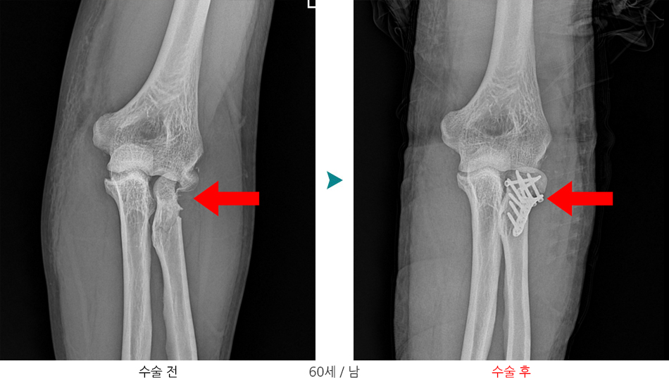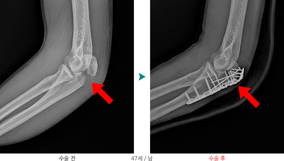 요골두골절과 구상돌기골절이 동반된 주관절 탈구는 주위 연부조직과 골조직에 심한 손상을 주는 복합손상으로 측부인대 손상이나 관절 불안정성이 흔히 동반되며 적절한 치료를 받지 않을 경우 합병증으로 만성관절 불안정성, 관절강직, 이소성 석회화 및 외상 후 관절염등이 흔히 발생하기 때문에 예방을 위해서는 적절한 치료와 재활이 필요하며, 적절한 치료를 받지 못하거나 치료시기를 놓치는 경우 팔꿈치 인공관절 전치환술을 시행해야하는 상태로 이어질 수 있습니다.